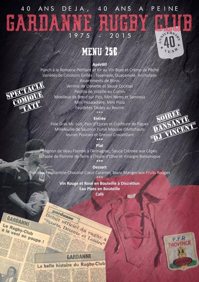 Pensez à venir fêter les 40 ans de votre club ..... Publié le 3 octobre 2015 par Gardanne Rugby Club Gardanne Rugby Club fête ses 40 ans le 31 octobre 2015 à la maison du Peuple à Gardanne Publicité